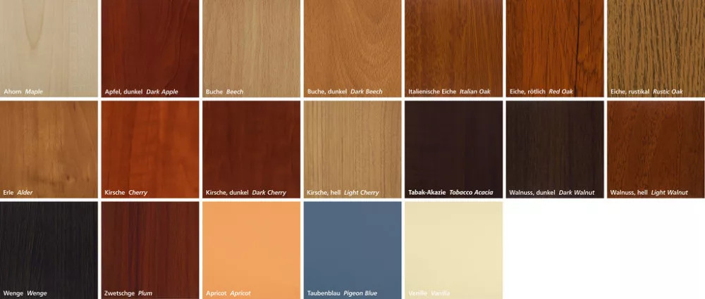 Maple, Dark Apple, Beech, Dark Beech, Italian Oak, Red Oak, Rustic Oak, Alder, Cherry, Dark Cherry, Light Cherry, Tobacco Acacia, Dark Walnut, Light Walnut, Wenge, Plum, Apricot, Pigeon Blue, Vanilla, grey (standard) and white.
